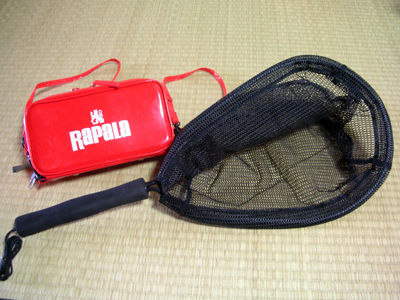 右の画像は【ランディングネット】 玉網持つのはかさばるのでコンパクトなタイプを選択。